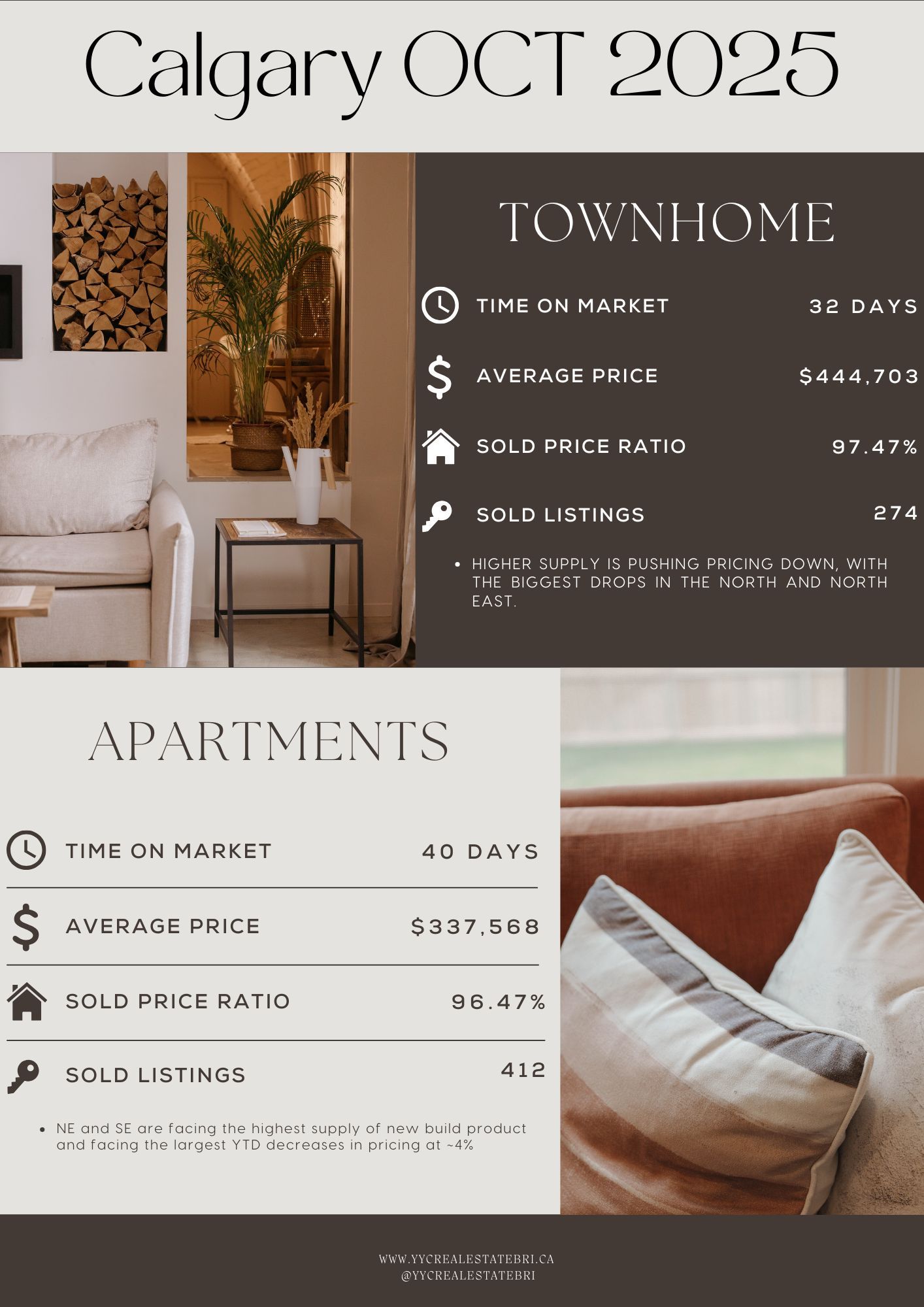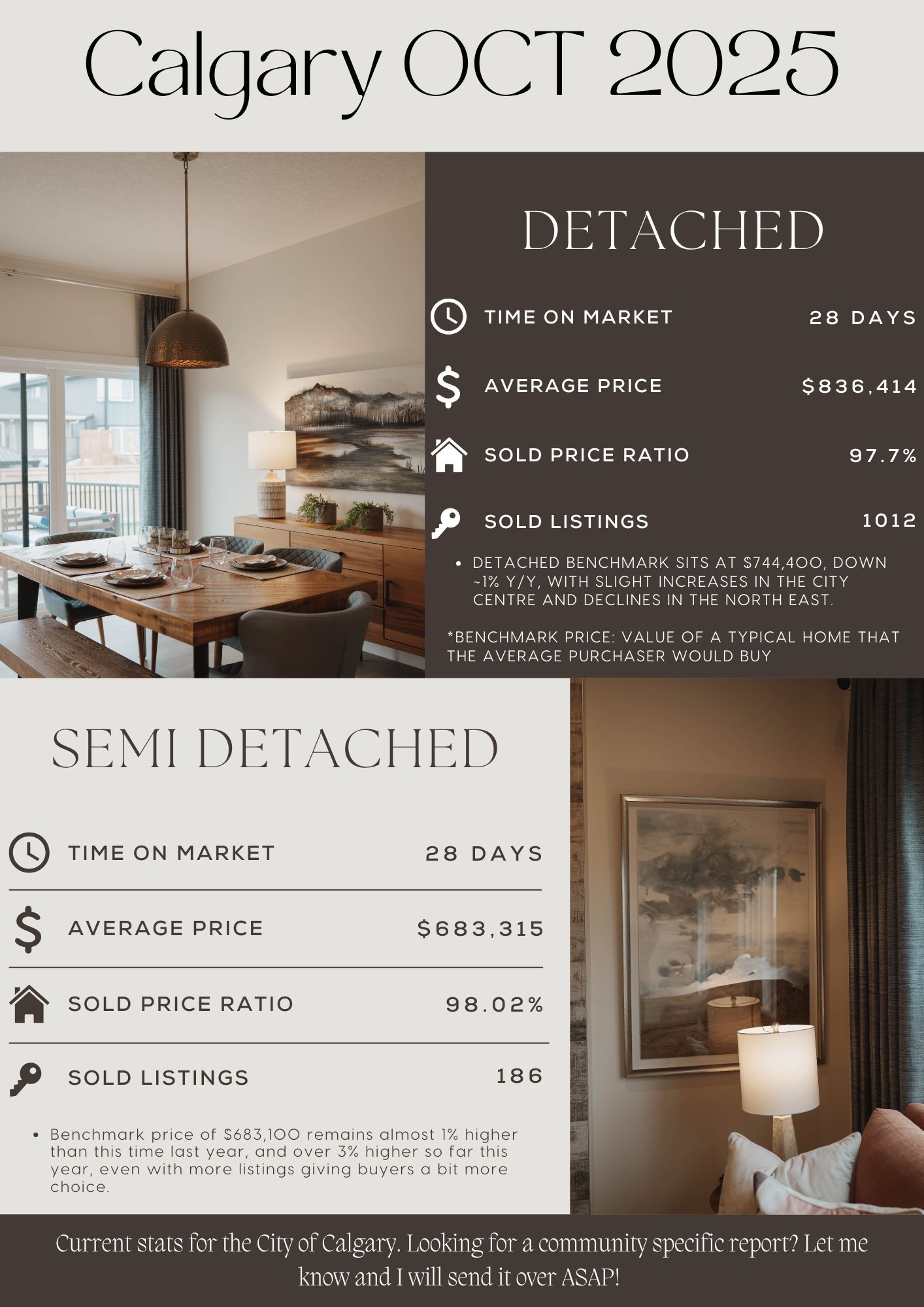 Calgary’s market is cooling, especially in the condo and townhome sectors, where record-high inventory is softening prices. Detached and semi-detached homes remain more stable, with balanced market conditions returning. Take a further look at the average time on market, average sold price, sold price to list price ratios and the # of sold units for each property type.